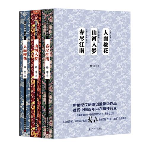 格非的《江南三部曲》是他历时十余年完成的长篇作品,深入思考并描写一百年来中国社会、历史、知识分子等问题。江南三部曲分别是指:《人面桃花》、《山河入梦》、《春尽江南》。《人面桃花》是“江南三部曲”的开卷之作。小说讲述晚清末年、民国初年江南官宦小姐陆秀米与时代梦想、社会剧变相互纠缠的传奇人生。《山河入梦》讲述女主人公姚佩佩遭遇家庭变故从上海来到梅城,与梅城县县长谭功达的悲情故事。《春尽江南》则展现了一对渐入中年的夫妻及其周边一群人近二十年的人生际遇和精神求索,透视时代巨变面临的各种问题。
