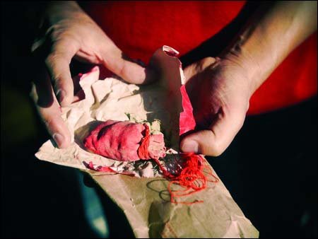 菜篮子原本是杨丽萍的母亲在菜地里摘菜用的。一次看到母亲正用它盛刚摘下来的菜,杨丽萍觉得篮子很美,就跟母亲要来,自己用。竹编的,底部是方形的平底,放置时很稳,提手的长度刚好适合挎着。这种篮子在云南民间很常用,杨丽萍说过,她小时候去地里摘菜拎只篮子,打猪草、背弟弟妹妹的时候则是背个竹筐,这是一种习惯。