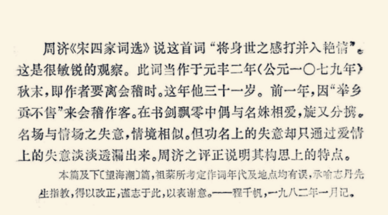 由上文可知,程千帆在1983年11月《宋词赏析》第三次印刷时,对书做过修订,并写了一则附记。由于《宋词赏析》很受读者欢迎,版本众多,我在查找这条附记的时候,竟无意中发现,个别后印的版本,是以《宋词赏析》初印或二印本为底本的。换句话说,所据是个错误的版本。