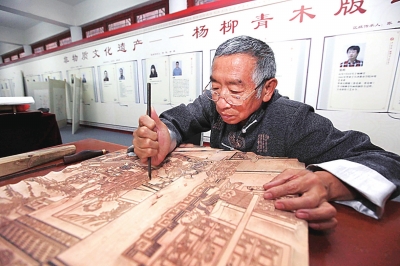 杨柳青年画老艺人在雕刻年画的木版 CFP