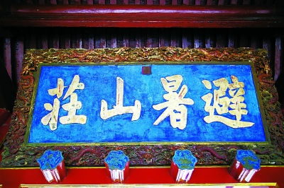 避暑山庄正殿大门的上方悬有一块匾,上面写着“避暑山庄”四个镏金大字,为康熙皇帝的御笔,仔细看去就会发现,“避”字右边的“辛”下部多写了一横。据史料记载,康熙皇帝特意加了一笔,是他认为:“此是避暑之避,不是避难之避”。原来,皇上是忌讳“避”字有“逃避”的意思,不吉利,所以大笔一挥加上一横,这样就没有“逃避”之意了。
