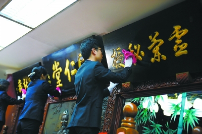 每年“二月二”龙抬头,老字号同仁堂药店会举行一次老传统——净(敬)匾仪式,三位优秀员工要擦拭“同仁堂”金字匾额以及两块配匾。