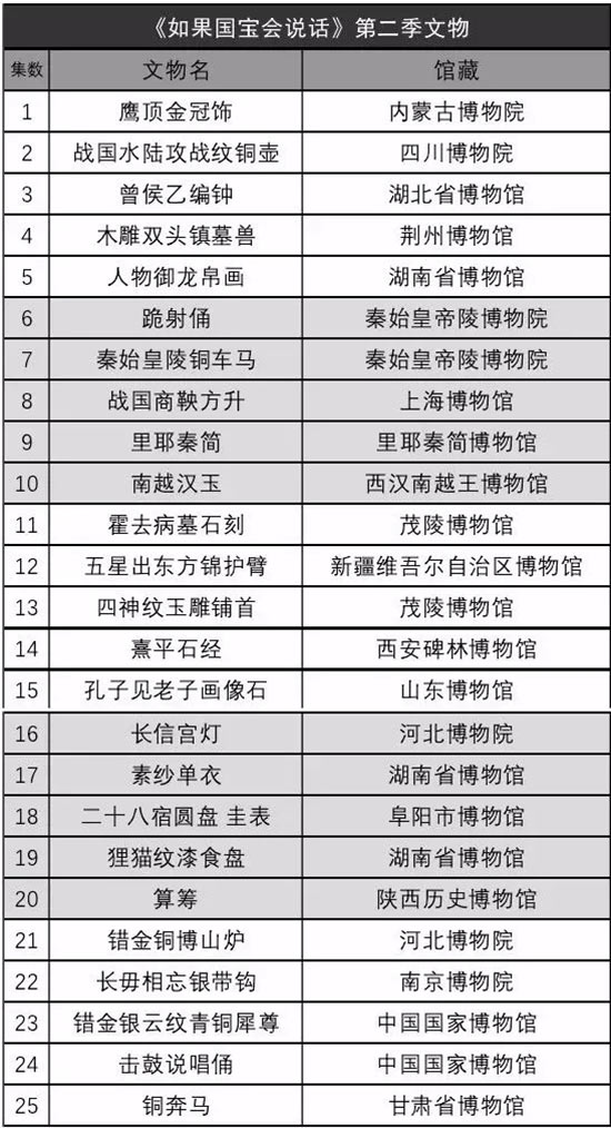 据悉,在第一季的陶器、玉器、青铜器之外,第二季也新增了漆器、石刻、简牍、织锦等文物类型。本季以“超级连接,超越想象”为主题,讲述战国至秦汉时期的25件文物,并将继续采取与观众平视交流的姿态,让国宝活起来。