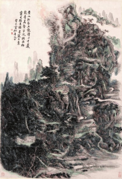 《黄山松谷五龙潭》黄宾虹 纸本 设色 纵168.5厘米 横120厘米 1953年中国美术学院藏