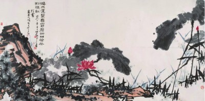 《映日荷花别样红图》潘天寿 纸本 设色 纵137.5厘米 横272.5厘米 1960年中国美术学院美术馆藏