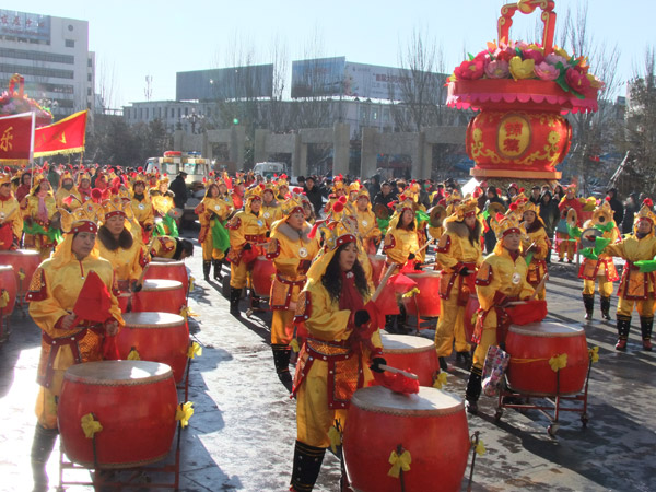 第一支上场表演的是老年秧歌队,由110名员工家属组成的老年秧歌队,穿着崭新的秧歌服饰,踩着节奏鲜明的锣鼓点,扭得落落大方,把观看的区队员工和家属们逗得笑逐颜开。接下来上场表演的是威风锣鼓队,90名威风锣鼓队员在领队的统一指挥下,挥动着鼓槌,动作舒展大方,节奏铿锵有力,敲出了威风锣鼓的八面威风,把整个的秧歌表演场面推向了高潮。在场的观众们报以热烈的掌声。