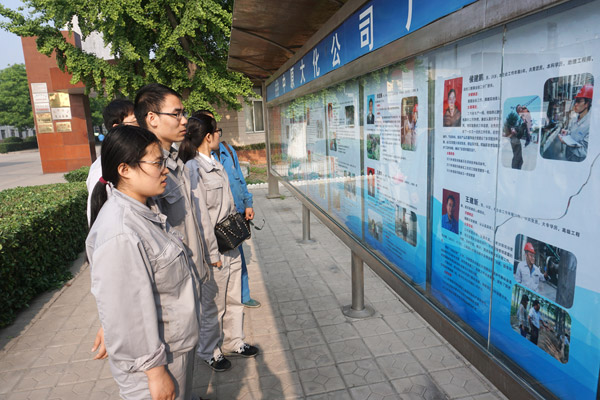 河南能源集团中原大化公司举办劳模先进人物事迹图片展 来源:河南能源集团中原大化公司 作者:吕标伦 时间:2016-05-01 【字体:小 大】 为大力弘扬劳模精神,集中展现企业各级劳模先进人物的光荣事迹,“五一”前夕,河南能源中原大化公司举办了以“弘扬劳模精神,争做时代楷模”为主题的“大化情·劳动美”劳模先进人物事迹图片展。图为4月29日,刚下夜班的中原大化职工在宣传橱窗前驻足观看劳模先进人物事迹图片展。 智能标签: 河南能源集团 中原大化公司 相关内容 分享到: 【打印正文】