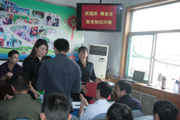 在区队学习室,女工协管员和青年志愿者精心准备了井下常用安全知识题,通过员工喜爱的有奖问答形式,加深一线员工对安全操作知识的重视和理解,女工协管员们为员工发放了安全警句,送上了安全祝福,叮嘱广大员工过节莫忘安全,坚持正规操作,确保安全生产。活动的开展进一步增强了一线员工学规程、学业务、保安全的积极性和主动性,营造了浓厚的安全氛围,促进了安全生产。