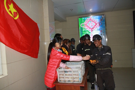 12月24日,山东能源新矿集团金黄庄矿业公司团总支开展 “送平安、话祝福”活动,组织团员青年志愿者到井口候车室将一枚枚饱含真情和安全期盼的“平安果”、“黄金桔”送到矿工手中。