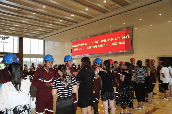 7月13日,炎炎夏日,中煤集团大屯煤电公司徐庄煤矿工会家属协管会组织十名矿嫂到井口候罐大厅,开展“矿嫂井口迎亲人、送清凉”活动。 矿嫂们用一个深情的拥抱、一句句朴实的话语温暖着丈夫的心,她们为自己的丈夫擦拭脸上的汗水和污渍,送上西瓜、雪糕、水放在丈夫的手中。矿嫂张楚说:“结婚这么多年,这是第一次亲眼看到老公上井后的模样,熟悉又陌生,更多的是心疼!”矿嫂们纷纷表示一定叮嘱他们时刻牢记安全,自己照顾好家、照顾好老人孩子,不让丈夫操心,让他安心工作!孔部长希望大家把这瞬间的感动长久地记在心间,对丈夫多体贴、照顾,让丈夫开开心心工作,多为矿安全生产做贡献!