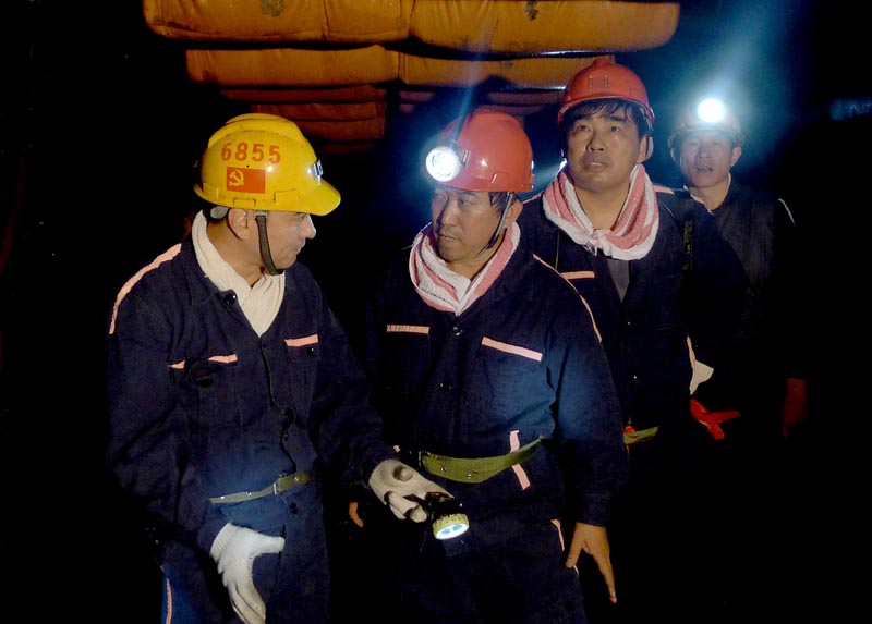 杨庄矿领导向解海龙讲解下安全防范设施
