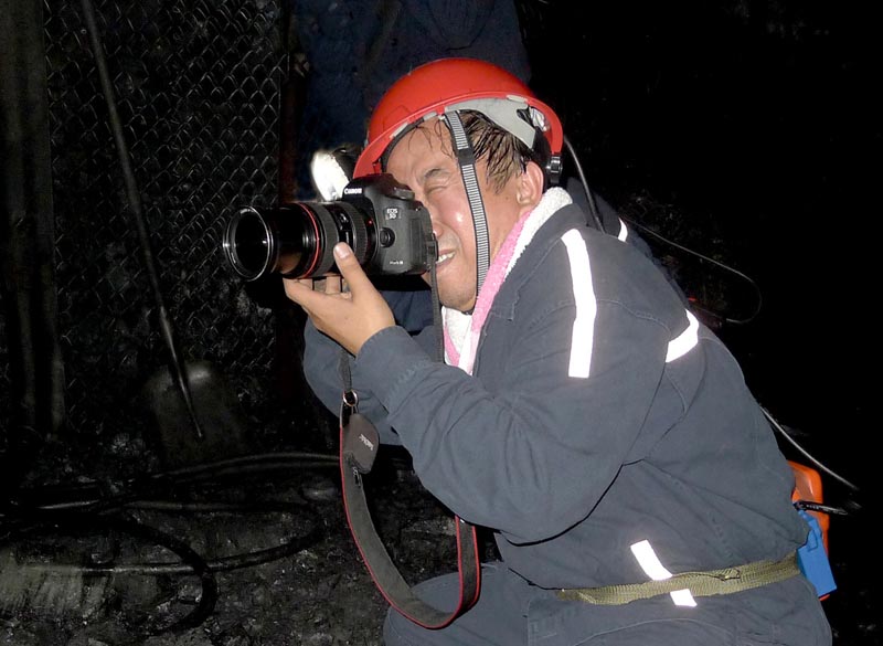 11月16日举行摄影讲座后,解海龙先后深入井口、车间、灯房、煤场及职工浴池等现场进行摄影创作,每拍几幅审视之后他都连连叫好,对拍摄效果表示满意!17日上午解海龙在杨庄矿领导陪同下深入到井下巷道和掘进头采访创作,拍摄了大量反映矿工劳作的照片。升井后他激动地说:我笫一次下井,感触颇多,所到之处都是现代化、人性化管理。煤矿是一个火热的战场,矿工作为劳动者是伟大的,可歌可泣的,作为摄影人,我要多多接触矿山,表现矿工,更多更好地塑造伟大的中国矿工的形象!