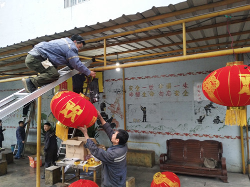 该矿在各办公楼门口挂起了一盏盏大红灯笼,树上结满了一串串五彩灯饰,将矿区装扮得“年味”十足。鲜艳的红灯笼充满了浓浓的喜庆气氛,象征着矿工的生活越来越红火。夜晚,闪烁耀眼的彩灯把矿山装点得多姿多彩,整个矿区呈现出一派生机勃勃、欣欣向荣的景象。