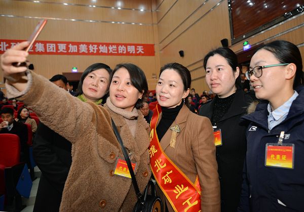 图(1)淮北矿业女职工正与“女工匠”许程程拍照合影。