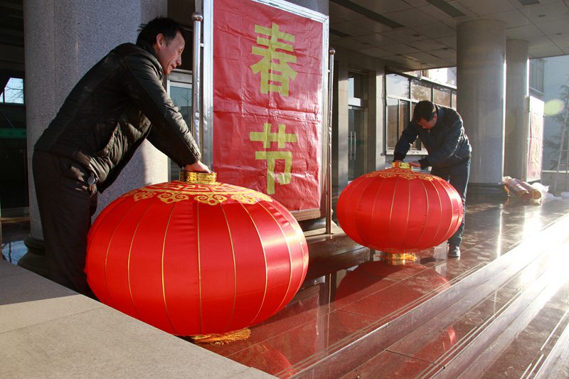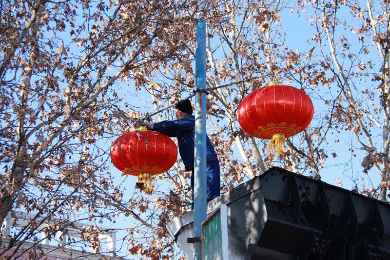 在矿区平安广场、工人村主街道,该矿基层各单位职工正忙着将一串串的大红灯笼挂到办公楼、大门口、甬道树上,另一边其它单位的职工也忙着给旁边的树上挂上小彩条旗,给矿区和工人村添上一抹喜庆靓丽的春色。