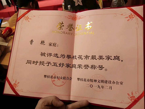有耕耘就会有收获,在今年的攀枝花市妇女第十次代表大会上,曹艳家庭获得了攀枝花市“最美家庭”殊荣,同时被授予“五好家庭”荣誉称号。