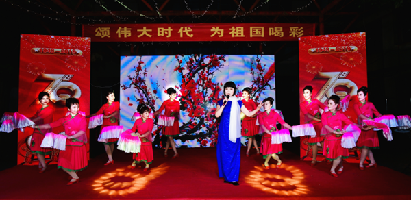 离退休服务站代表队演唱歌曲《中国,鲜红的太阳永不落》《南泥湾》。这支代表队最大年龄78岁,最年轻的56岁,从选歌、背词、合练、排练到演出,没有一人请假,离退休职工都拿出百分百的热情对待,用他(她)们的话说“我们吃过苦,但是我们也享福了。”“我们永远期盼祖国强盛、人民幸福”。