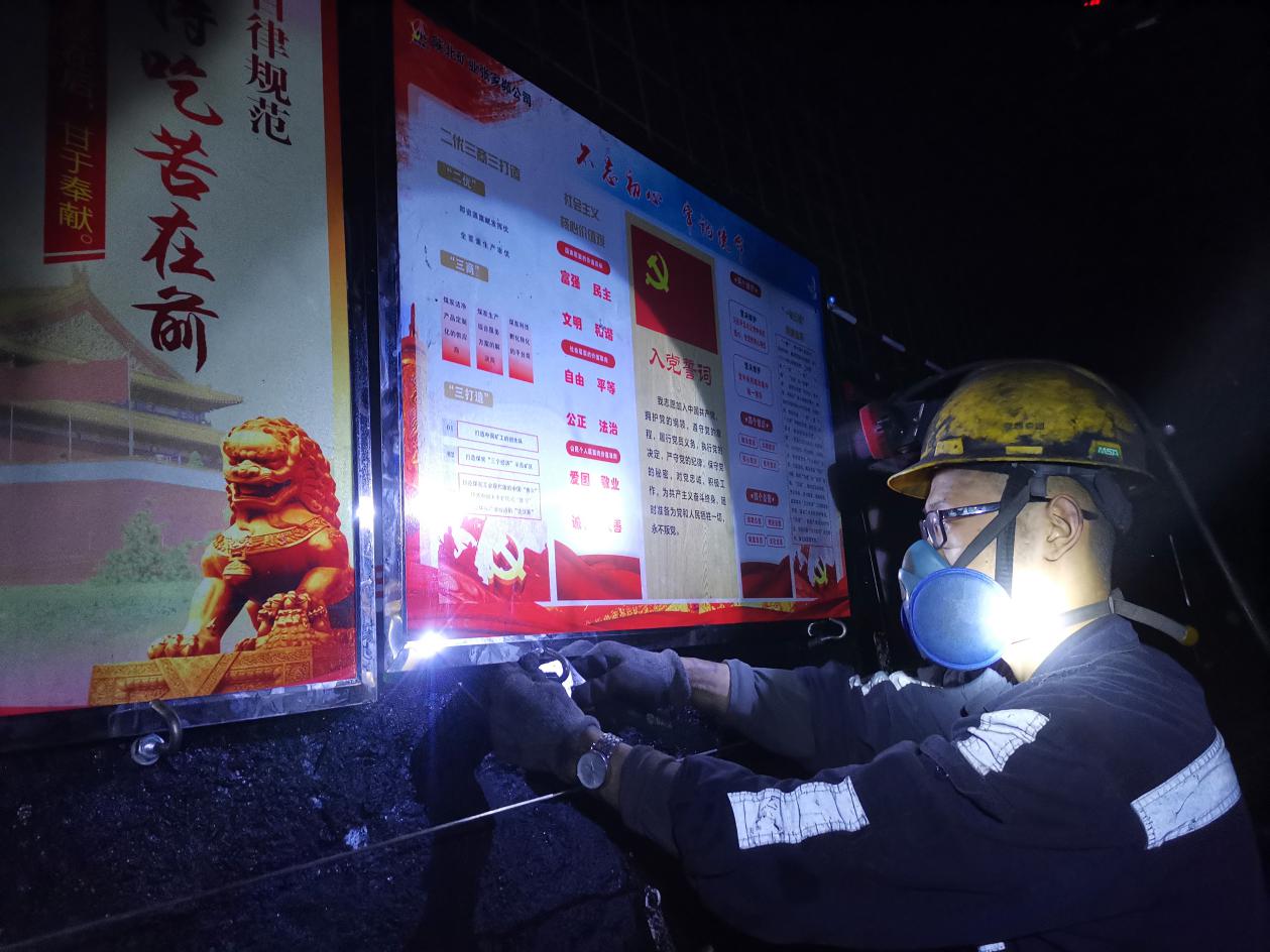 据悉,该队在工作面安装了大量具有党建文化气息的安全警示牌板,形成了党建文化长廊。安全文化牌板以“宣传安全文化,提高安全意识,厚植党建文化”为主题,贴近井下实际,深入职工群众,内容既有安全标语、亲情寄语,也有安全漫画。例如“党员带头抓三违、查隐患、遏事故”,“只争朝夕抓质量,凝心聚力保安全”等,内容丰富、覆盖面广,使职工在浓厚的党建安全文化氛围中学习安全知识,潜移默化的接受安全警示教育,树立“生命至上,安全为天”的生产理念。