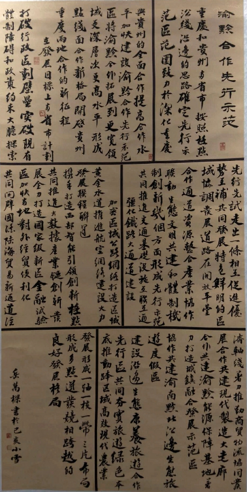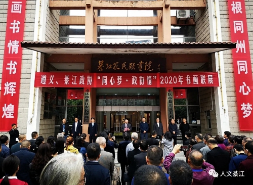 10月14日上午,由政协贵州省遵义市委员会、政协重庆市綦江区委员会,联合举办的“同心梦·政协情”2020年书画联展,在綦江区美术馆(綦江版画院)开展,重庆能投集团渝阳煤矿工会主席岳万樑创作的六尺行书《渝黔合作先行示范》和南桐洗选厂赵晓佳创作的楷书《爱莲说》参加展出并应邀参加了开幕式。