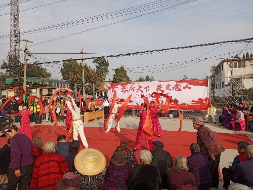 下午13:30,文艺志愿者们分别在铁西社区、物资部集合,分配乘坐车辆,嘱咐安全注意事项,68位文艺志愿者承载着社会责任感和时代使命感,浩浩荡荡奔赴太平镇纪沟村。14:30到达演出现场,200多名乡亲已经早早在观候观看演出,志愿者们看到这一幕,很受感动,演出的劲头更足了。15:00准时演出,精彩节目依次上场,优美的舞姿,欢快的音乐,激情的表演,现场掌声阵阵,老人们赞不绝口。16:30文艺演出落下帷幕,老人们久久不愿离开,还想继续欣赏热烈喜庆、丰富多彩的文艺节目。