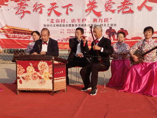 晚上18:00,自愿者们马不停蹄来到大束镇钓鱼台村,连盒饭也顾不得吃,立即装台、安装灯光、调试音响,集合人员。19:00准时演出。乐音绕耳、歌舞欢腾,68名文艺志愿者精神抖擞,情绪饱满,忘却白天演出的辛苦和疲劳,16个精彩节目继续上演。晚会在节奏欢快、豪迈奔放的秧歌舞《好日子》中拉开帷幕。歌曲《母亲》《祖国万岁》,深情的表达了对父母养育之恩的感激之情和对祖国浓烈真挚的情感;情景朗诵《美丽乡村我的家》展现了新时代乡村发展欣欣向荣、人民生活幸福甜美;舞蹈《高山流云》舞出了老年人积极向上的精神风貌,舞出了新时代老年人的风采;表演唱《新康定情歌》《天使的身影》展示着老龄人的强健体魄和对老年人的美好祝福;家国情怀,薪火传承,儿童朗诵《中华孝道》体现了新时代好少年的新风貌、新姿态,小朋友们的精彩表演和字正腔圆的童音,获得了阵阵掌声;京剧《咏梅》、豫剧《穆桂英挂帅》选段、《回到山沟沟》《边疆处处是江南》《赛马》等节目,让台下观众听得如痴如醉,表演者们生动细腻的表演、婉转动人的唱腔博得了老人们的阵阵喝彩;晚会在激奋人心的歌伴舞《最美不过夕阳红》中圆满落下帷幕。