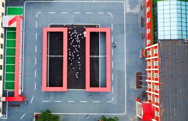 位于室外的第三单元学史力行见行动大课堂,“永远跟党走,奋进新征程”“心系群众办实事,聚焦发展解难题”主题系列展组成“100”的图案,象征着建党100周年。