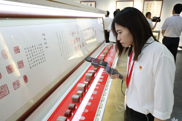 百枚篆刻、百枚印章陈列在展厅的中心位置,左侧凝炼的四字篆刻由矿区5名退休党员历时15天完成,内容展现了1921年到2021年每年的重大事件。右侧的百枚印章则以革命思想精神篇、农业农村篇、脱贫攻坚篇、从严治党篇等十个序列的主题来呈现。