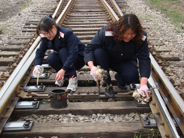 罕井车站共有南北两头扳道房,王婉妮所在的北扳道房较为偏僻,距离车站两公里。除北头八、九道未铺设电动道岔需要人工扳道外,她的主要工作就是执行接发列车、引导接车、检查和布置进路、看护岔区设备、养护道岔等。记得2008年那场50年不遇的暴雪持续了半月有余,白天扫雪,夜间除冰,雪最大的时候,这边刚扫完,那边又落上了,25组道岔轮着扫,在雪里一站就是一整天,夜间气温骤降,所有道岔尖轨与滑床板都冻住了,她和工友一个人用喷灯烤,一个人用棉纱擦雪水。往往是化开了这组,那组很快又冻上……来来回回十多次的反复,才使道岔恢复正常。双手冻得红肿、双脚被渗湿的鞋袜长时间浸泡变得麻木、头发结成冰絮,然而看着那满载的列车从身边徐徐而过时,心里却是暖的。因为敬业担当,王婉妮在公司首届扳道员技术比武中荣获二等奖,在扳道员中级技能鉴定中荣获理论、实践双第一。