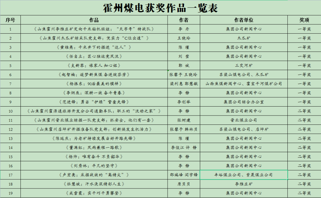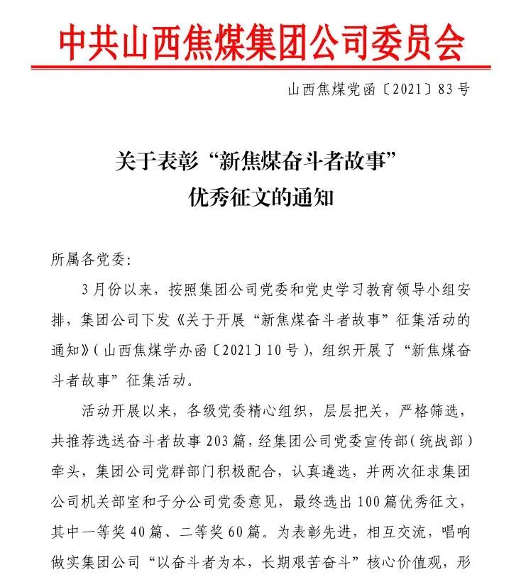 12月10日,山西焦煤党委下发《关于表彰“新焦煤奋斗者故事”优秀征文的通知》,共评选表彰了100篇优秀征文。其中,一等奖40篇,二等奖60篇。霍州煤电共有9件征文作品荣获一等奖,10件征文作品获二等奖。
