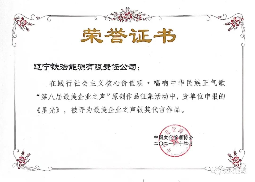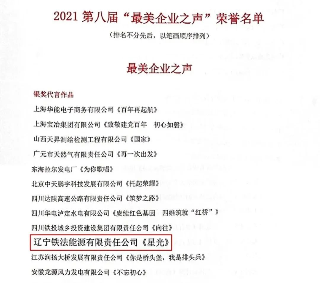 其中,辽宁铁法能源公司荣获“新时代党建+企业文化示范单位”荣誉称号,铁法能源公司申报的庆祝建党百年MV作品---《星光》荣获“第八届最美企业之声”银奖代言作品,并在光明网“最美企业之声”专栏进行展示展播。