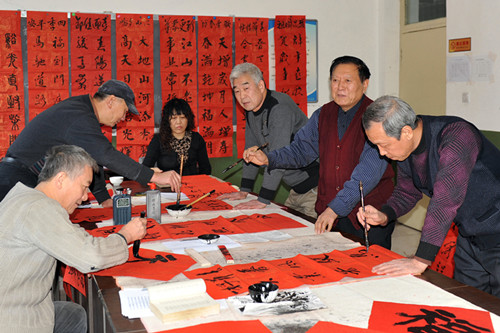1月21日,杜儿坪矿老年大学书法班学员正在书写春联,迎接甲午新年。山西焦煤西山煤电集团杜儿坪矿工会近日组织书法爱好者为矿区职工写春联、送春联,迎接即将到来的马年春节。