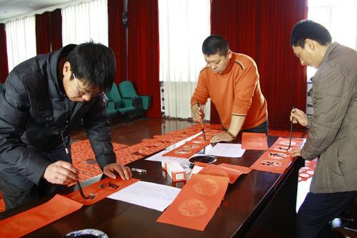 万马奔腾日,九州幸福春。为了让困难职工过上一个欢乐、喜庆的春节,龙煤集团七台河分公司运输部党委、工会特地为困难职工书写并赠送对联,表达组织对他们的深切关怀。图为七台河分公司运输部书法爱好者正在为困难职工义写春联活动。