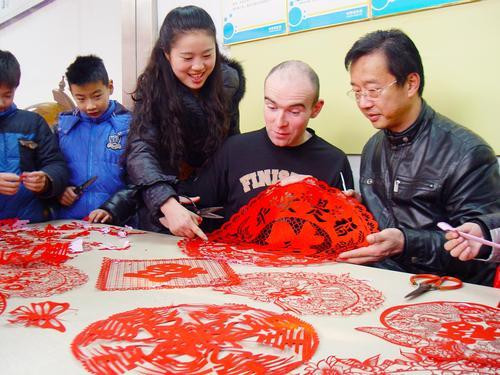 中国的新春佳节将到,淮北市教育局组织该市的一些留守儿童并邀请了外籍教师戴维开展了学习传统文化,迎接新春佳节的剪纸活动。让外籍教师感受中国传统文化的魅力,让外籍教师感受中国四海一家的博大胸怀。