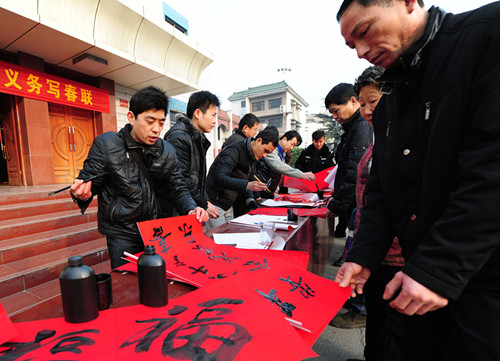 淮北矿业集团朱庄煤矿为矿工义务写春联 来源:淮北矿业集团朱庄煤矿 作者:陈召松 时间:2014-01-30 【字体:小 大】 1月28日上午,安徽淮北矿业朱庄煤矿工会、团委在该矿工业广场开展义务写春联活动,来自生产一线单位的10多名书法爱好者不畏严寒,挥毫泼墨,把一副副带着暖意与墨香的春联送到矿工及家属手中,为节日的矿山增添了一份喜庆祥和的氛围。 智能标签: 淮北矿业集团 朱庄煤矿 相关内容 分享到: 【打印正文】