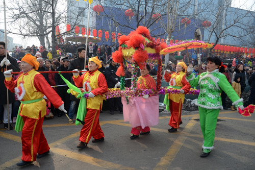 红绸彩扇,交相辉映;锣鼓唢呐,此起彼伏;一条条长龙,口喷火焰;一头头彩狮,欢腾跳跃;还有那旱船、跑驴、秧歌,各种传统民间文艺节目一一呈现,加上时尚的健美操表演和威风凛凛的武术表演,无论是表演者,还是观看者,人们喜上眉梢,乐在其中。