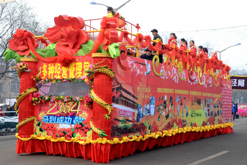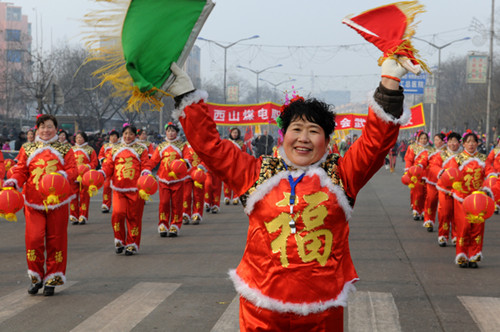 红绸彩扇,交相辉映;锣鼓唢呐,此起彼伏;一条条长龙,口喷火焰;一头头彩狮,欢腾跳跃;还有那旱船、跑驴、秧歌,各种传统民间文艺节目一一呈现,加上时尚的健美操表演和威风凛凛的武术表演,无论是表演者,还是观看者,人们喜上眉梢,乐在其中。