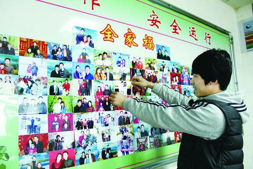 2月17日,山东能源淄矿集团亭南煤业公司机电队将职工春节假期新拍摄的全家福照片张贴上墙,让职工牢记亲情,时刻注意安全生产。图为职工正在粘贴照片。