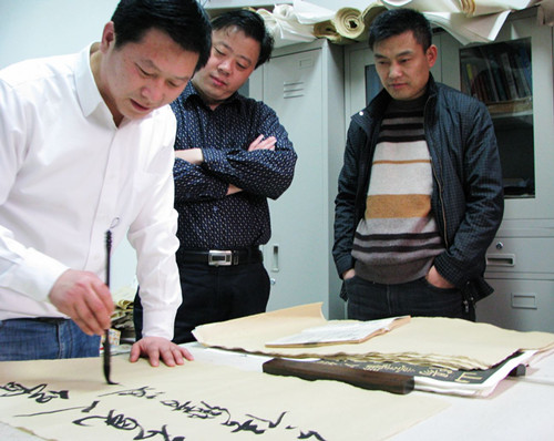 3月1日下午,安徽淮北矿业朱庄煤矿文化活动室内,翰墨飘香。10余位书画爱好者们欢聚一堂,兴致勃勃,挥毫泼墨,潜心书画艺术创作。由该矿工会、文学艺术界联合会、书画协会联合举办的书画笔会正在进行。参加笔会的书画爱好者们,用手中的笔书写和谐社会,讴歌新时代,赞美新矿山,同时在艺术的道路上兢兢业业、不懈追求。