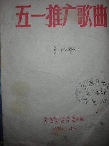 3月15日,笔者在河北省石家庄旧书市场看到了一册上个世纪五十年代出版的《五一推广歌曲》小册子。这本推广歌曲为山西群众艺术馆和太原市文化局合编,时间为1958年4月10日。从时间上看,这是五一劳动节前夕文化部门为庆祝五一劳动节而专门编辑下发的,对基层开展五一歌曲演唱活动具有很大的指导作用。