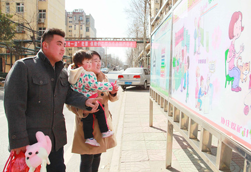 山东能源新矿集团协庄煤矿以贴近群众、贴近生活、贴近基层为导向,积极开展温馨化、个性化婚育新风进万家宣教活动。围绕群众所需,通过设立计生宣传一条街,制作图文并茂的宣传牌板和进家入户送关爱等形式,让职工群众及时了解人口计生动态,引导广大育龄群众树立科学、文明、进步的婚育观念,不断提升计生工作水平。图为社区居民观看计生宣传漫画。