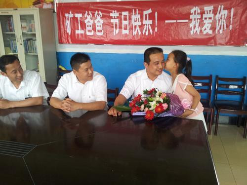 在父亲节来临之际,山东能源枣矿集团田陈煤矿组织开展了以矿工爸爸节日快乐我爱你为主题的安全宣教活动。矿工子女向一线职工宣读了《致矿工爸爸的一封安全信》,然后孩子向爸爸送上了鲜花并大声说出:爸爸我爱你!让一线职工深深地感受到家庭的幸福、孩子的可爱,从而进一步增强了自主保安意识。图为一名少年儿童为自己的父亲献上吻,以表达对父亲的爱。