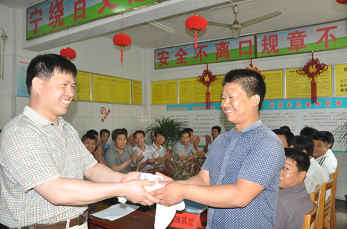 为扎实开展安全月各项活动,积极营造良好工作氛围,6月12日,在采煤、掘进、运输等单位的中班班前会上,国投新集三矿工会、团委和安检等联合开展了以强化红线意识,促进安全发展为主题的班前安全知识有奖竞答活动。图为采煤一队职工回答正确后喜领奖品的情景。