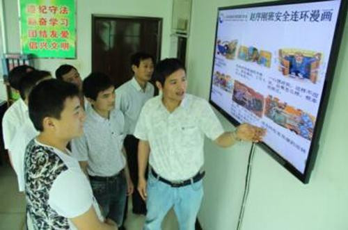 火红的6月,山东能源淄矿集团唐口煤业公司普掘二队创新安全教育方式,利用区队班前班后会安全教育学习时间,组织三班班长将掘进施工中的敲帮问顶、矿车运输、支架支护等习惯性违章现象的安全连环漫画课件,逐一向班组职工讲解,强化安全为天的思想,及时让班组职工远离三违,告别三违,确保安全作业。