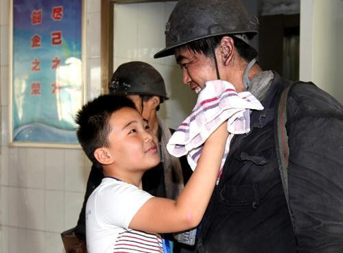叔叔、伯伯辛苦了!孩子们稚嫩的祝福声和要为矿工擦汗的举动,瞬间在刚刚升井的矿中形成一道动人的风景。