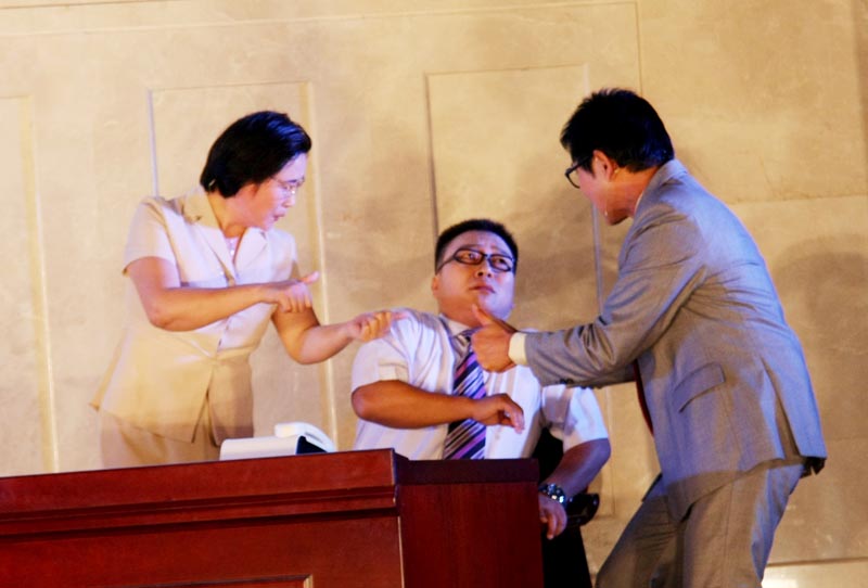 中国煤矿文联主席梁嘉琨向双鸭山矿业集团颁发特别贡献奖,双鸭山矿业集团纪委书记、工会主席林森领奖