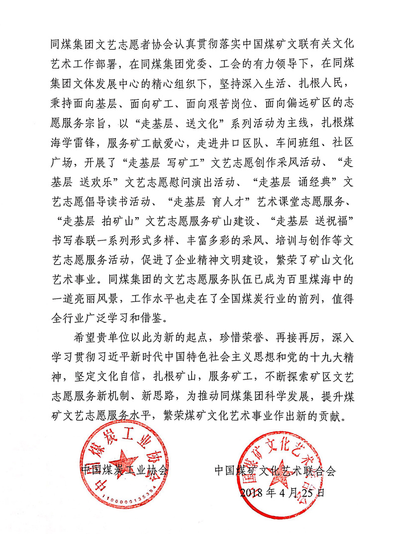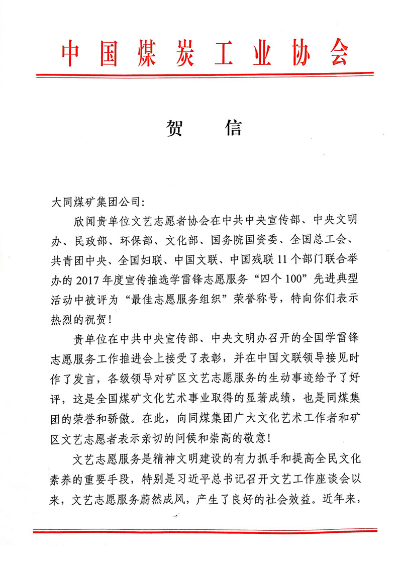 中国煤炭工业协会和中国煤矿文联向同煤集团致贺信 来源:中国煤炭工业协会 作者: 时间:2018-04-25 【字体:小 大】 智能标签: 中国煤炭工业协会 中国煤矿文联 同煤集团 文艺志愿 相关内容 分享到: 【打印正文】