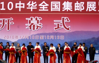 2010中华全国集邮展览12月10日在杭州开幕,中华全国集邮联合会名誉会长、全国政协副主席黄孟复同志出席开幕式并和中华全国集邮联合会会长杨贤足、浙江省人大常委会副主任程渭山、浙江省人民政府副省长王建满等领导为展览剪彩。国家邮政局副局长徐建洲和中国邮政集团公司副总经理、中华全国集邮联合会副会长冯新生为邮展纪念邮资名信片揭幕。