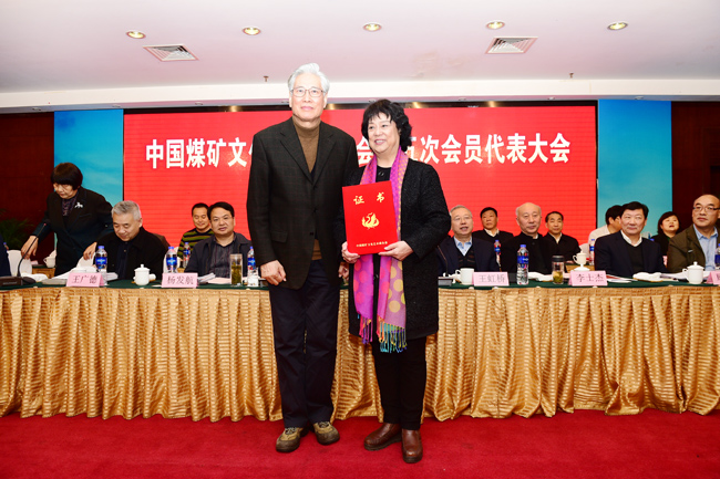 庞崇娅为新当选的中国煤矿文联秘书长盛军颁发证书