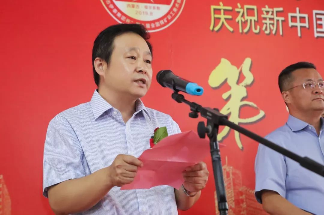 张强向内蒙古伊泰集团赠送了第五届中国煤矿艺术特别贡献奖杯并代表第五届中国煤矿艺术节组委会讲话。他指出,这一届展览,集中展示了煤矿美术界新时期的优秀创作成果,是煤炭行业贯彻习近平总书记对在新的历史条件下做好文艺工作“四个坚持”要求的具体举措。这些美术作品表现形式丰富,表达内容广泛。展现了广大煤矿美术工作者们饱含爱矿热情和追梦精神,扎根矿山,立足黑色沃土,在波澜壮阔的新时代挥彩泼墨、状景描物,用一双双巧手绘就一幅幅美好矿山生活的五彩画卷。他强调,新时代要有新作为。广大煤矿文艺工作者们要不惜脚力、聚集眼力、开动脑力、强化笔力,积极投身火热的煤矿生活,用立得住、叫得响、传得开的优秀文艺作品讴歌矿山、赞美矿工,记录新时代煤炭工业的辉煌发展成果,向伟大的新中国成立70周年献礼!