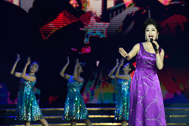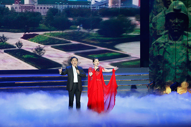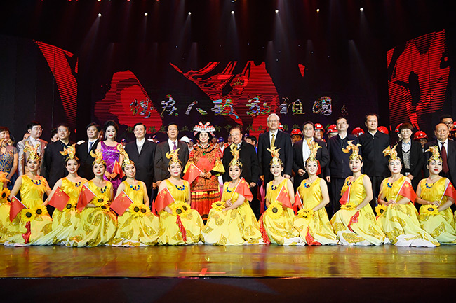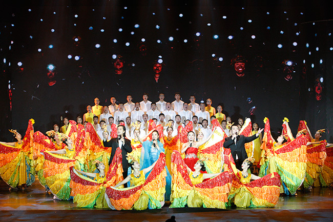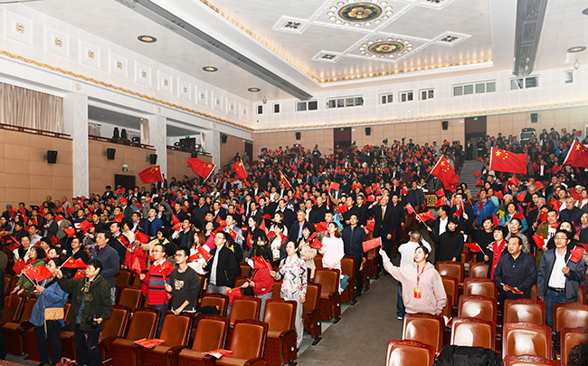 “五星红旗迎风飘扬,胜利歌声多么响亮,歌唱我们亲爱的祖国,从今走向繁荣富强……”最后,现场观众全体起立,随着音乐的节拍,挥舞手中的五星红旗,放声高唱《歌唱祖国》,把展演推向高潮。